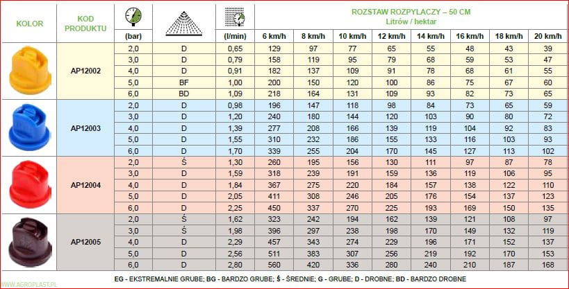 - Kolorystyka i wydajność zgodna z normą ISO dla rozpylaczy polowych;